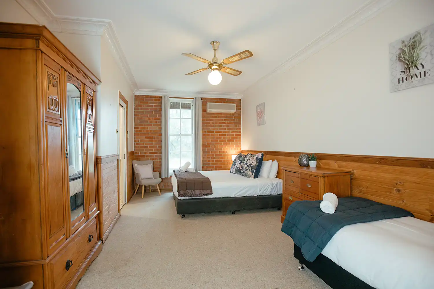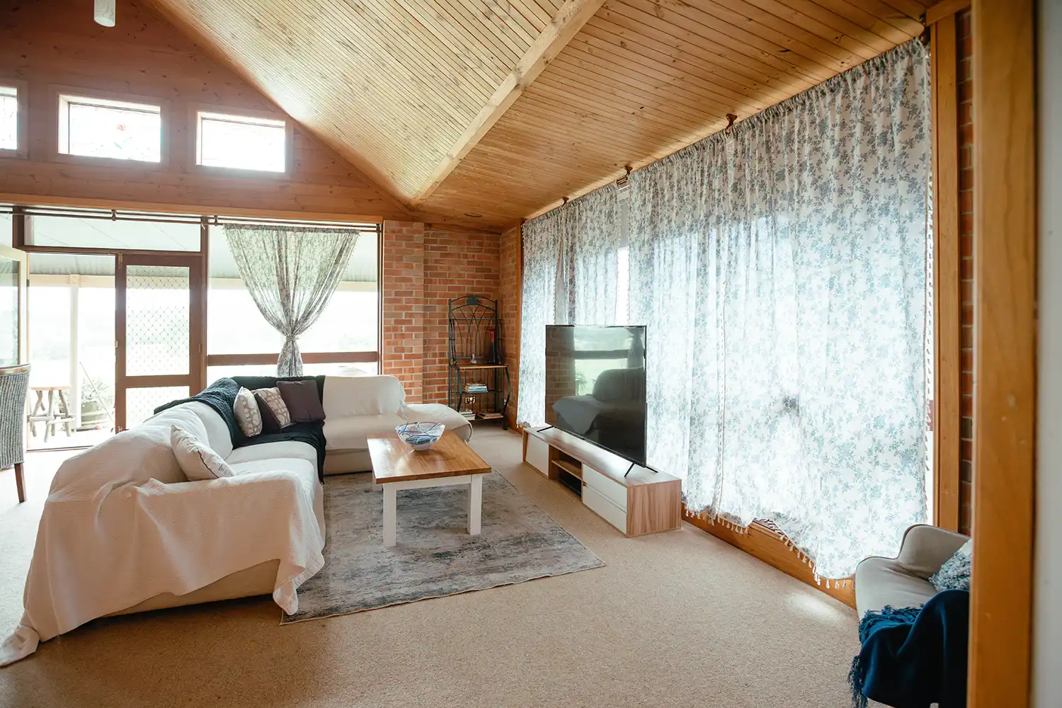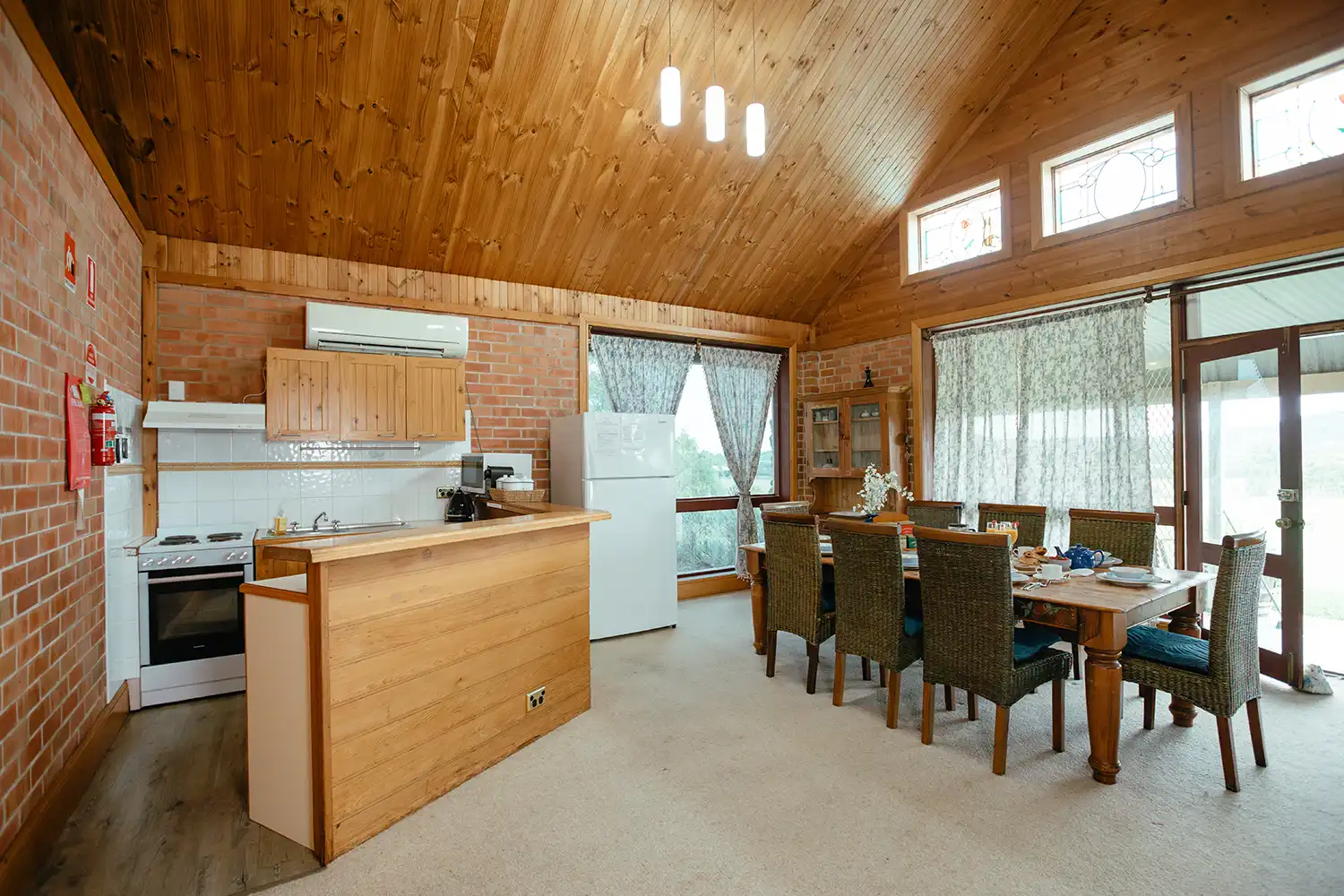 Accommodation comprises three bedrooms, each with its own ensuite, making The Chalet particularly appealing for groups or families travelling together. Additional shared spaces include a dedicated billiards room and a large undercover entertaining area with gas BBQ facilities – ideal for casual meals, celebrations or relaxed afternoons enjoying the estate’s peaceful surroundings.