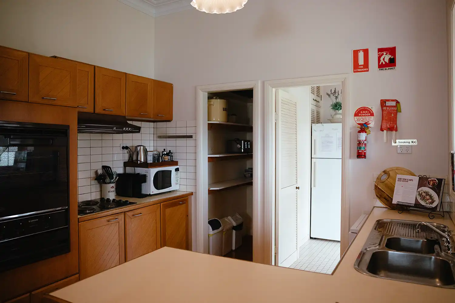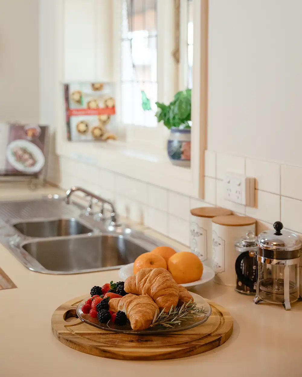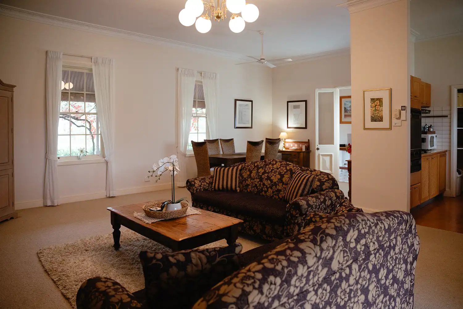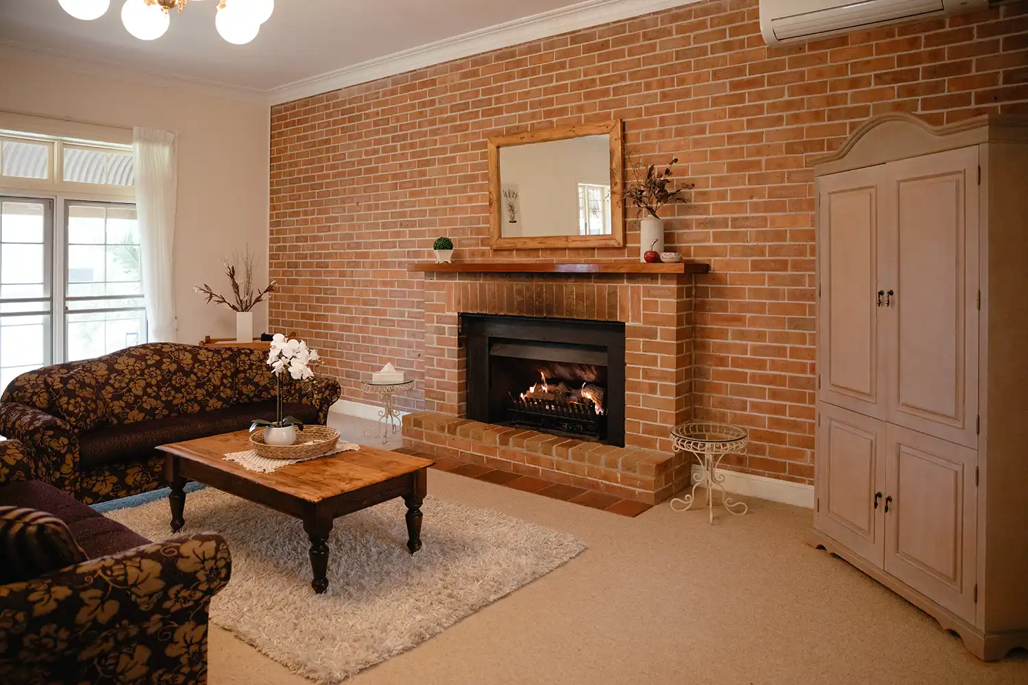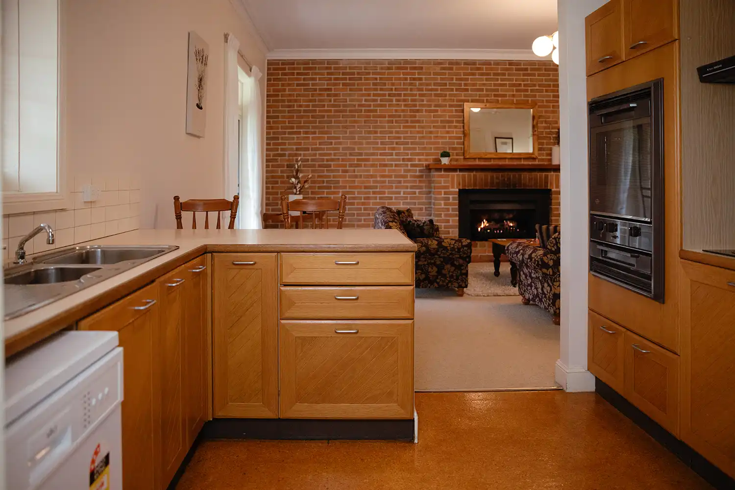 Inside, the spacious lounge and dining area is designed for slow mornings and cosy evenings, featuring reverse cycle air conditioning and an open gas log fireplace. A TV and DVD player provide simple entertainment, though many guests find the quiet rhythm of the estate encourages them to truly switch off.